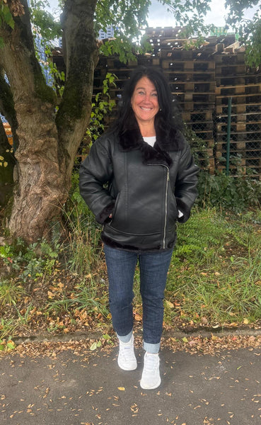 Diese modische Jacke vereint lässigen Biker-Look mit kuscheliger Wärme. Außen in hochwertiger Kunstleder Optik gearbeitet, ist sie innen komplett mit weichem Teddyfell (natürlich nicht echt) gefüttert – vom großen Kragen bis hin zu den Armbündchen. So hält sie angenehm warm und sieht dabei stylisch aus.