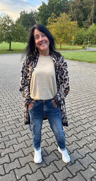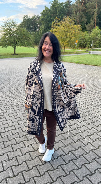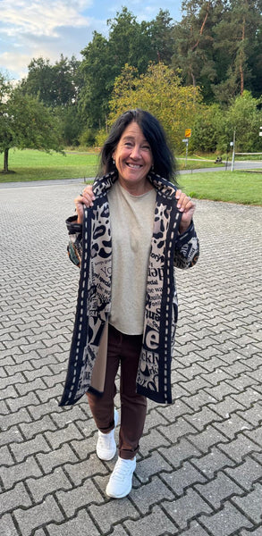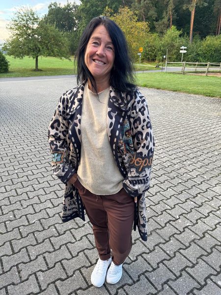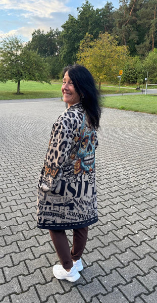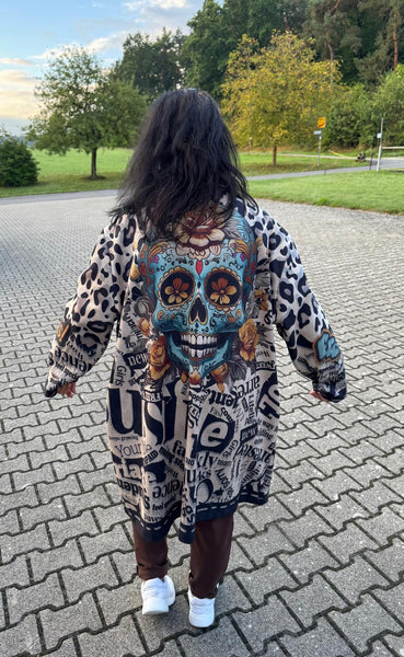 Ein Mantel, der Blicke fesselt und Persönlichkeit ausstrahlt! Dieses außergewöhnliche It-Piece vereint wildes Leopardenmuster mit coolen Schriftzügen und einem eindrucksvollen Totenkopf-Print im Stil der „Sugar Skulls“ – ein echtes Highlight für alle, die Mode nicht nur tragen, sondern leben.