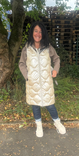 Eine vielseitige Weste, die durch ihre charakteristische Wabenoptik und den dezenten Glanz sowohl sportlich als auch chic kombiniert werden kann