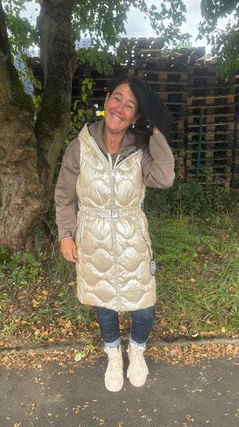 Diese lange, leicht glänzende Steppweste überzeugt mit ihrer modernen Wabensteppung, die für eine feminine Silhouette sorgt und gleichzeitig wärmt. Mit ihrer komfortablen Passform (Weite ca. 48 cm, Länge ca. 93 cm) und der festen Kapuze mit Kordelzug ist sie der ideale Begleiter für Übergangszeit und kühle Tage.