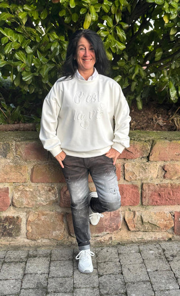 Kombiniere diese Jeans mit einem schlichter Bluse oder T-Shirt oder Hoodie und Sneakern für einen lässigen Alltagslook mit urbanem Flair