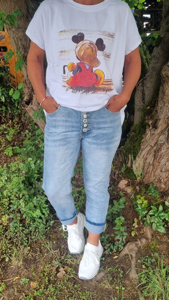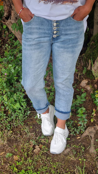 Diese wunderschöne 5-Pocket-Sommerjeans ist der perfekte Mix aus Stil und Komfort! Der leicht verkürzte, knöchellange Schnitt verleiht ihr eine moderne Note und macht sie ideal für warme Tage. Ein besonderes Highlight sind die sechs unterschiedlichen, liebevoll gestalteten Knöpfe auf der Vorderseite, die der Jeans eine einzigartige Optik verleihen. Die dezente Waschung sorgt für einen lässigen Look und lässt sich vielseitig kombinieren. Erhältlich in den Größen S-L