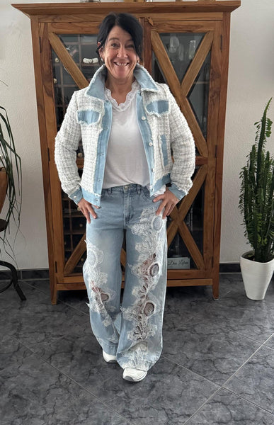 Diese Jeans ist ein absolutes Statement-Piece! Der klassische Denim-Look wird durch die kunstvollen weißen Spitzen-Applikationen entlang der Beine elegant aufgewertet – für einen unverwechselbaren, femininen Style mit modischem Twist.