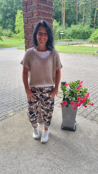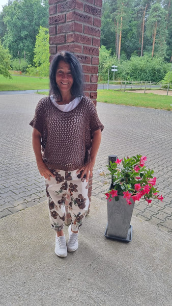 Mit einer Brustweite von ca. 60 cm und einer Länge von ca. 65 cm fällt er locker und schmeichelt jeder Figur. Der weiche Materialmix aus 70 % Baumwolle, 20 % Acryl und 10 % Viskose trägt sich angenehm leicht auf der Haut.