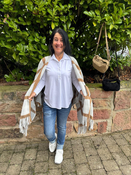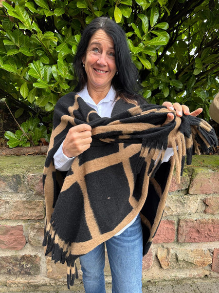 Dieses elegante Poncho-Cape überzeugt mit einem modernen Karodesign in harmonischen Naturtönen. Es lässt sich mühelos über jedes Outfit werfen und sorgt sofort für einen warmen, stilvollen Look.