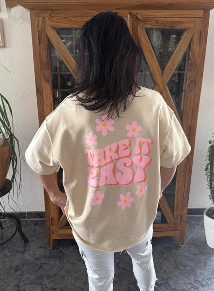 Vorne auf Brusthöhe sorgt der kleine pinke "take it easy" Print für entspannte Vibes, während auf dem Rücken sechs große Blumen in cooler Flower-Power-Optik den Look und den Schriftzug in groß abrunden. Erhältlich in vielen sommerlichen Farben – ein echtes Statement-Piece für warme Tage