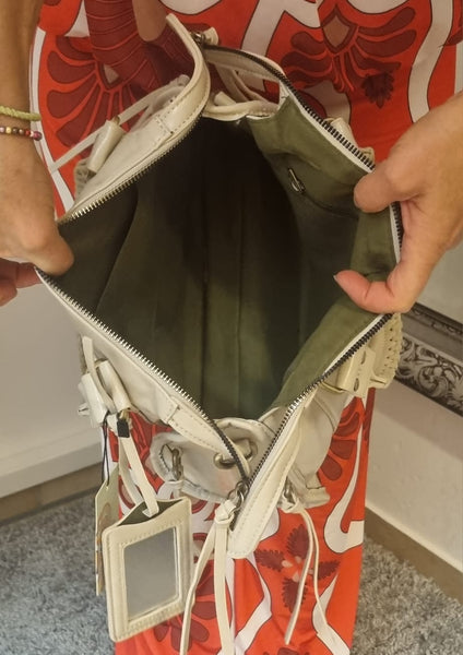 Dekorative Extras wie abnehmbare Bändchen, auffällige Metallic-Nieten und markante Ziernähte verleihen der Tasche das gewisse Etwas.