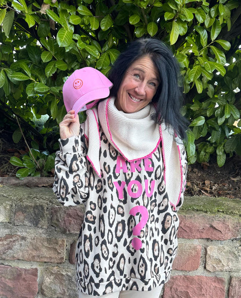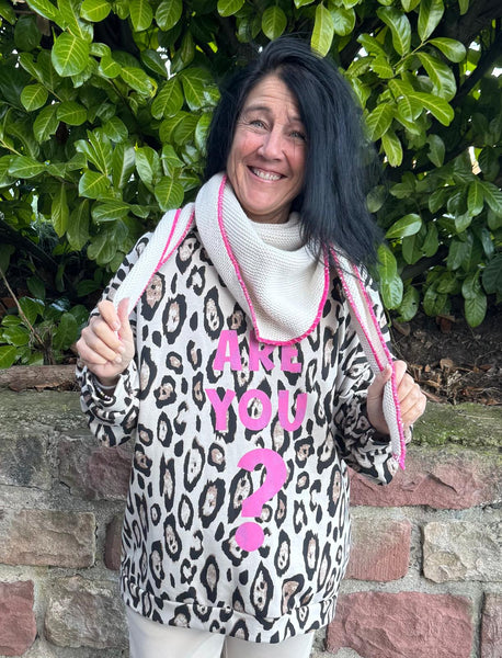 Lässiges Oversize-Sweatshirt mit auffälligem Leo-Muster und pinkem Print. Der moderne Frontdruck „ARE YOU?“ sowie der Smiley und das „K“ am linken Ärmel machen das Stück zu einem echten Hingucker. Durch den geraden, weit fallenden Schnitt eignet es sich perfekt für einen bequemen, modischen Alltagslook.
