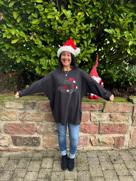 Dieses lässige und super bequeme Sweatshirt bringt sofort Weihnachtsstimmung in jeden Look! Der festliche „Ho Ho Ho“-Print wird durch glitzernde Weihnachtsmützen aus Strasssteinchen verziert – ein echter Hingucker, wie auf dem Foto zu sehen.