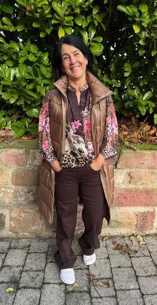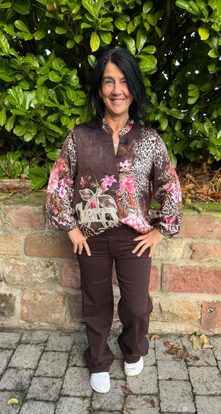 Diese außergewöhnliche Bluse überzeugt durch ihr edles Design und hohen Tragekomfort. Der schokobraune Grundton wird durch einen stilvollen Mix aus floralen Akzenten und Leopardenmuster aufgegriffen- ein echter Blickfang für modebewusste Frauen.