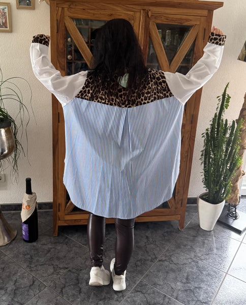Diese ausgefallene Oversize Bluse ist ein echter Blickfang: Der raffinierte Mix aus blau-weißen Streifen, Leo-Print und unifarbenen Partien verleiht ihr einen modernen, individuellen Look. Die lockere Passform sorgt für Bewegungsfreiheit und Komfort – perfekt für alle, die Mode lieben, die nicht von der Stange kommt.