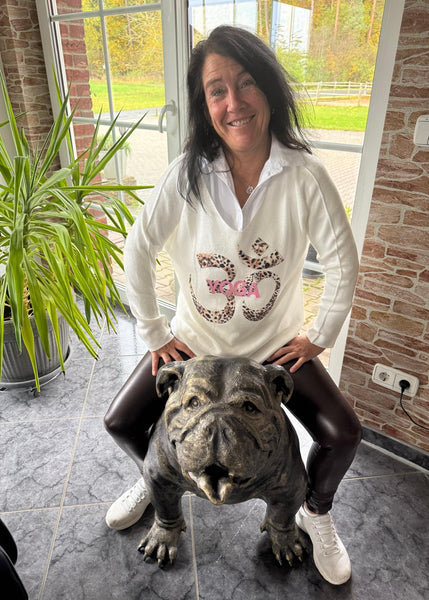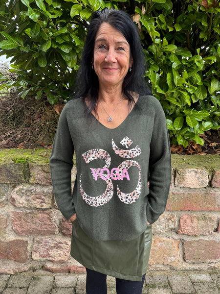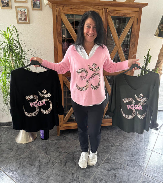 Ein echter Wohlfühl-Pullover mit Statement! Der weiche Feinstrick und der lockere Schnitt machen diesen Pullover zum idealen Begleiter für entspannte Tage. Der auffällige „Om/Yoga“-Print im Leo-Look setzt einen modischen Akzent und verleiht dem Basic das gewisse Etwas.