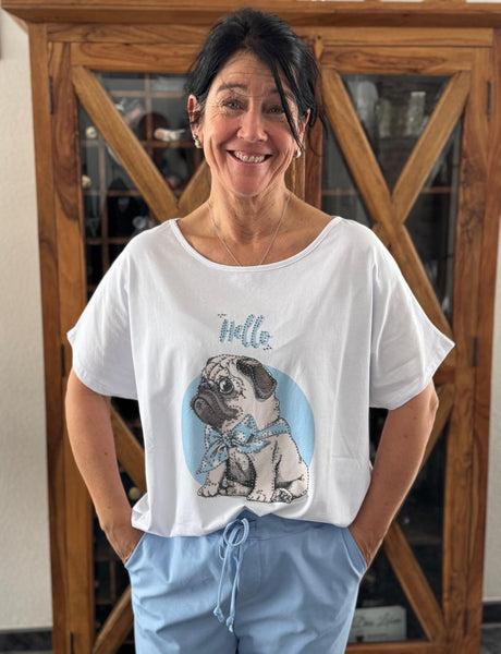 Super schönes T-Shirt mit Rundhalsausschnitt und Mops Aufdruck mit Schleife und dem Schriftzug "Hello". Der Aufdruck und Schriftzug ist mit dezenten Steinchen besetzt ( siehe Fotos )